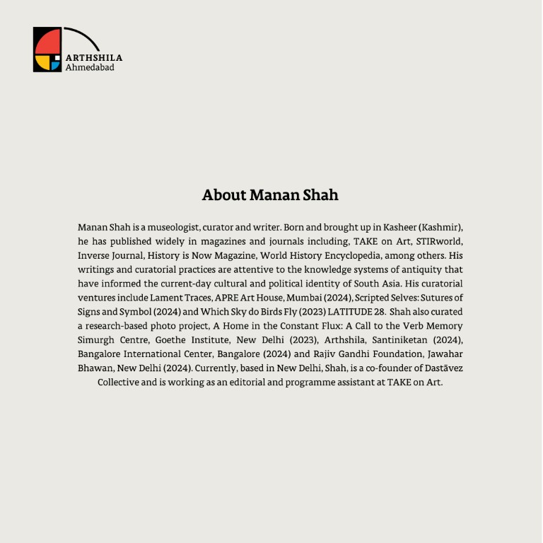 Manan Shah is a museologist, curator, and writer born in Kasheer (Kashmir). His writings have appeared in prominent platforms such as TAKE on Art, STIRworld, and Inverse Journal. His curatorial work focuses on the knowledge systems of antiquity that inform South Asia’s contemporary cultural and political identity. Shah’s notable projects include Lament Traces (2024), Scripted Selves: Sutures of Signs and Symbols (2024), and Which Sky Do Birds Fly (2023).