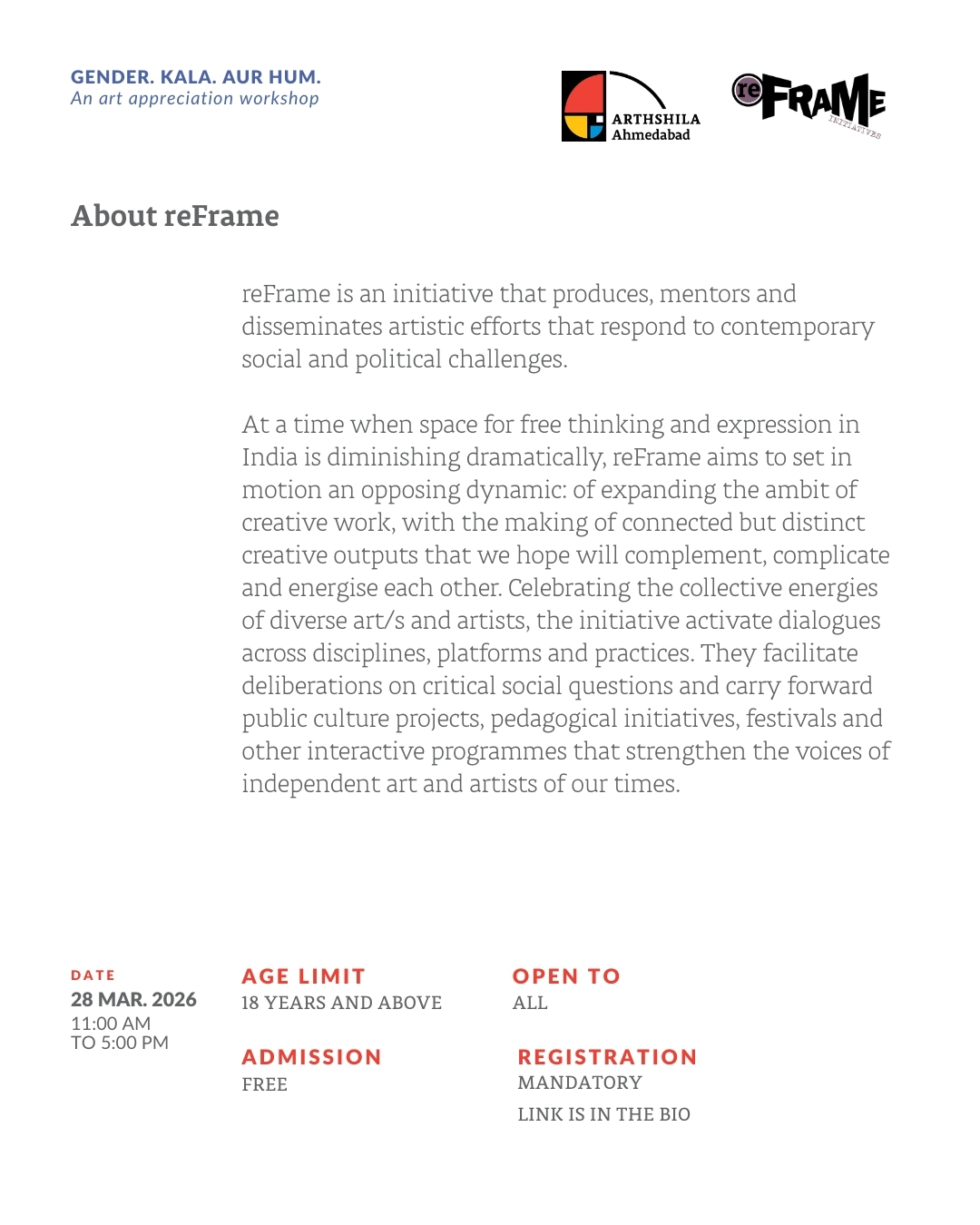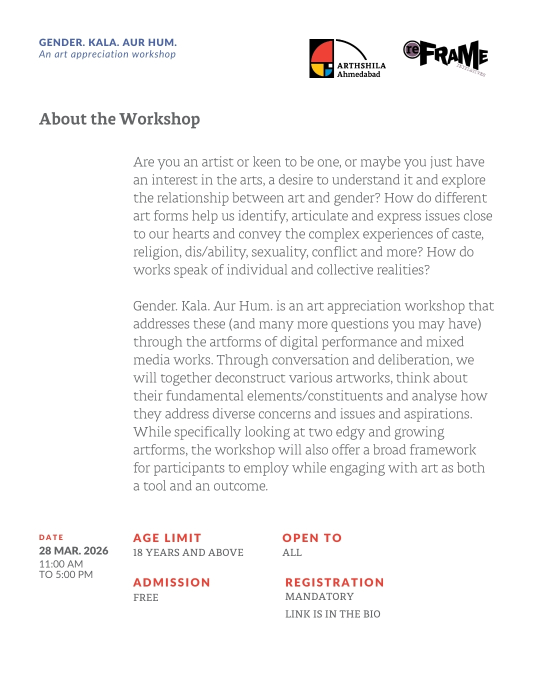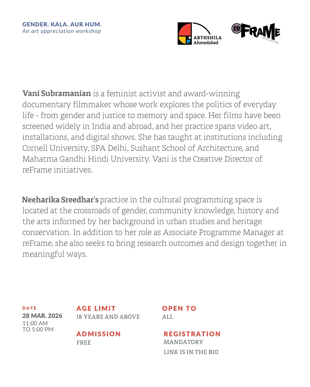 Join us for the workshop ๐—š๐—ฒ๐—ป๐—ฑ๐—ฒ๐—ฟ. ๐—ž๐—ฎ๐—น๐—ฎ. ๐—”๐˜‚๐—ฟ ๐—›๐˜‚๐—บ. by ๐—ฉ๐—ฎ๐—ป๐—ถ ๐—ฆ๐˜‚๐—ฏ๐—ฟ๐—ฎ๐—บ๐—ฎ๐—ป๐—ถ๐—ฎ๐—ป & ๐—ก๐—ฒ๐—ฒ๐—ต๐—ฎ๐—ฟ๐—ถ๐—ธ๐—ฎ ๐—ฆ๐—ฟ๐—ฒ๐—ฒ๐—ฑ๐—ต๐—ฎ๐—ฟ of ๐—ฟ๐—ฒ๐—™๐—ฟ๐—ฎ๐—บ๐—ฒ.