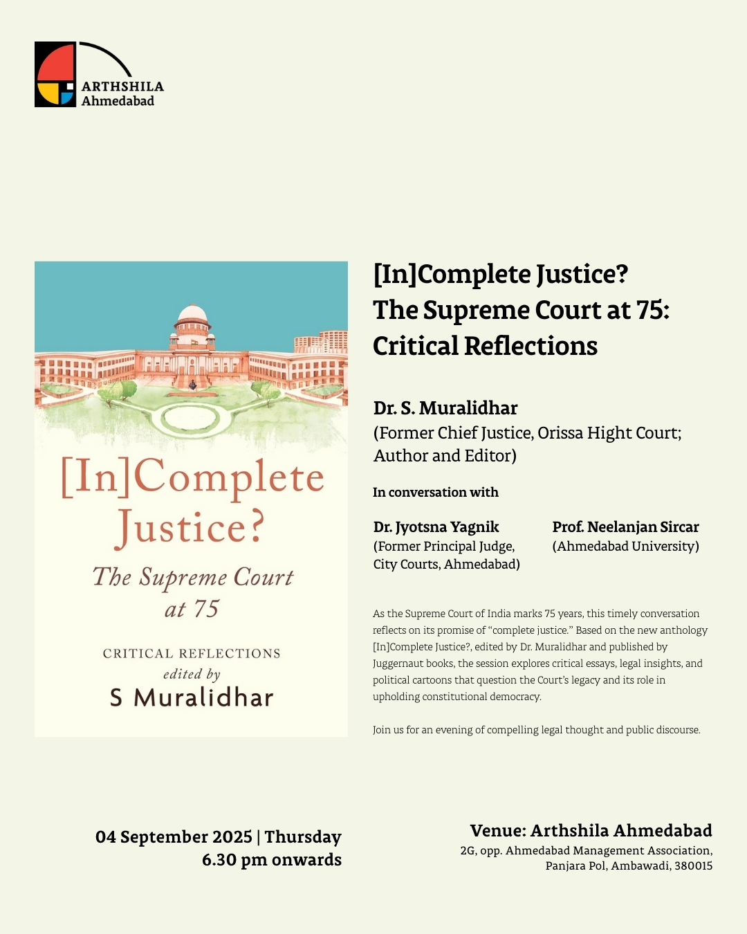 Join us for a conversation around the book ‘[In]Complete Justice? The Supreme Court at 75: Critical Reflections’ with Dr. S. Muralidhar (Former Chief Justice, Orissa Hight Court; Author and Editor), Dr. Jyotsna Yagnik (Former Principal Judge, City Courts, Ahmedabad) & Prof. Neelanjan Sircar (Ahmedabad University).