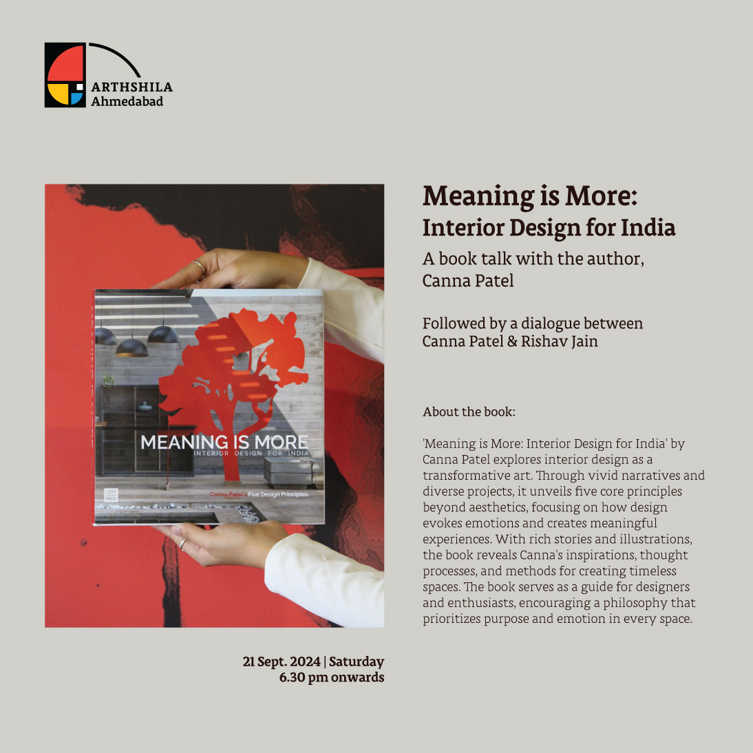 Arthshila Ahmedabad invites you for a talk, ‘Meaning is More: Interior Design for India’ with the author of the book, Canna Patel.