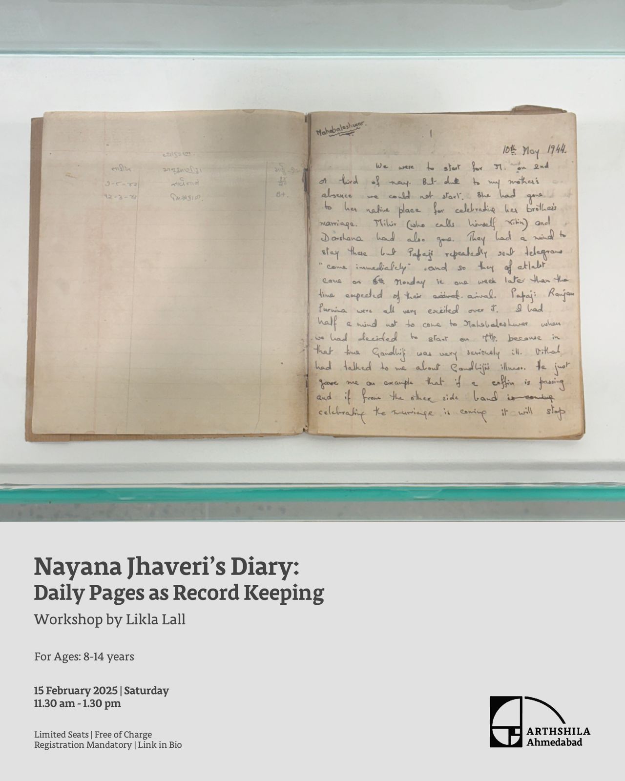 Let’s explore the archival exhibition ‘Nayana Jhaveri: A Life in Lasya’ as we look at the idea of personal and familial histories. The workshop focuses on Nayana’s diary, giving us a peek into the world and thoughts of a young girl growing up in the throws of India’s independence struggle. In turn, we take a moment to ponder upon our own place in history and the records each of us leaves behind. Join Likla in a walkthrough of the exhibition as she revisits parts of her family history, followed by a hands-on session on creating a practice of journaling.