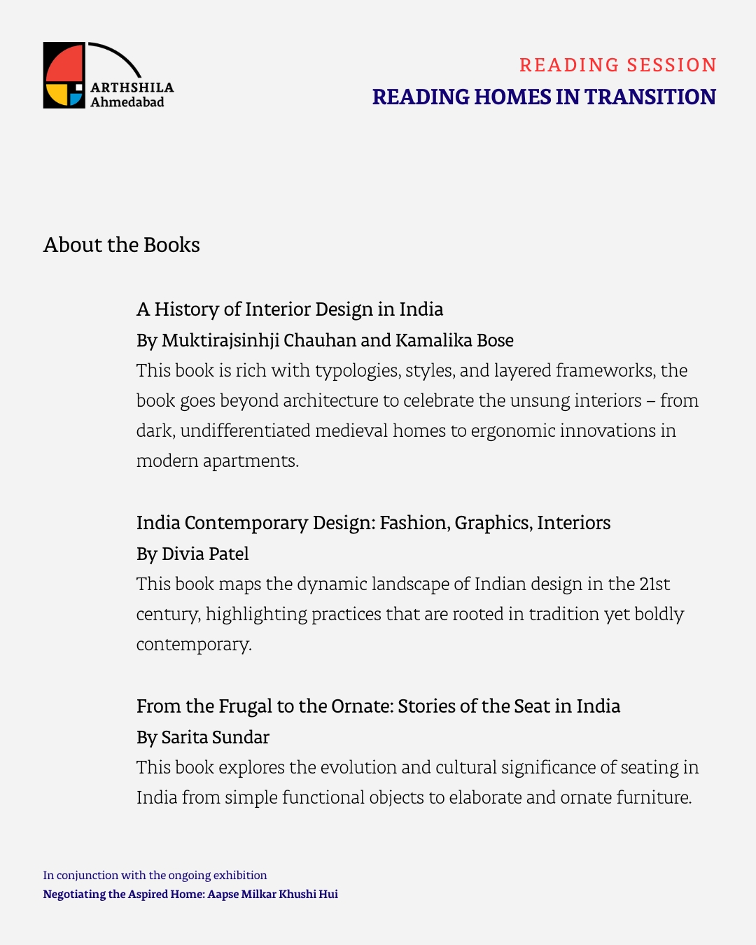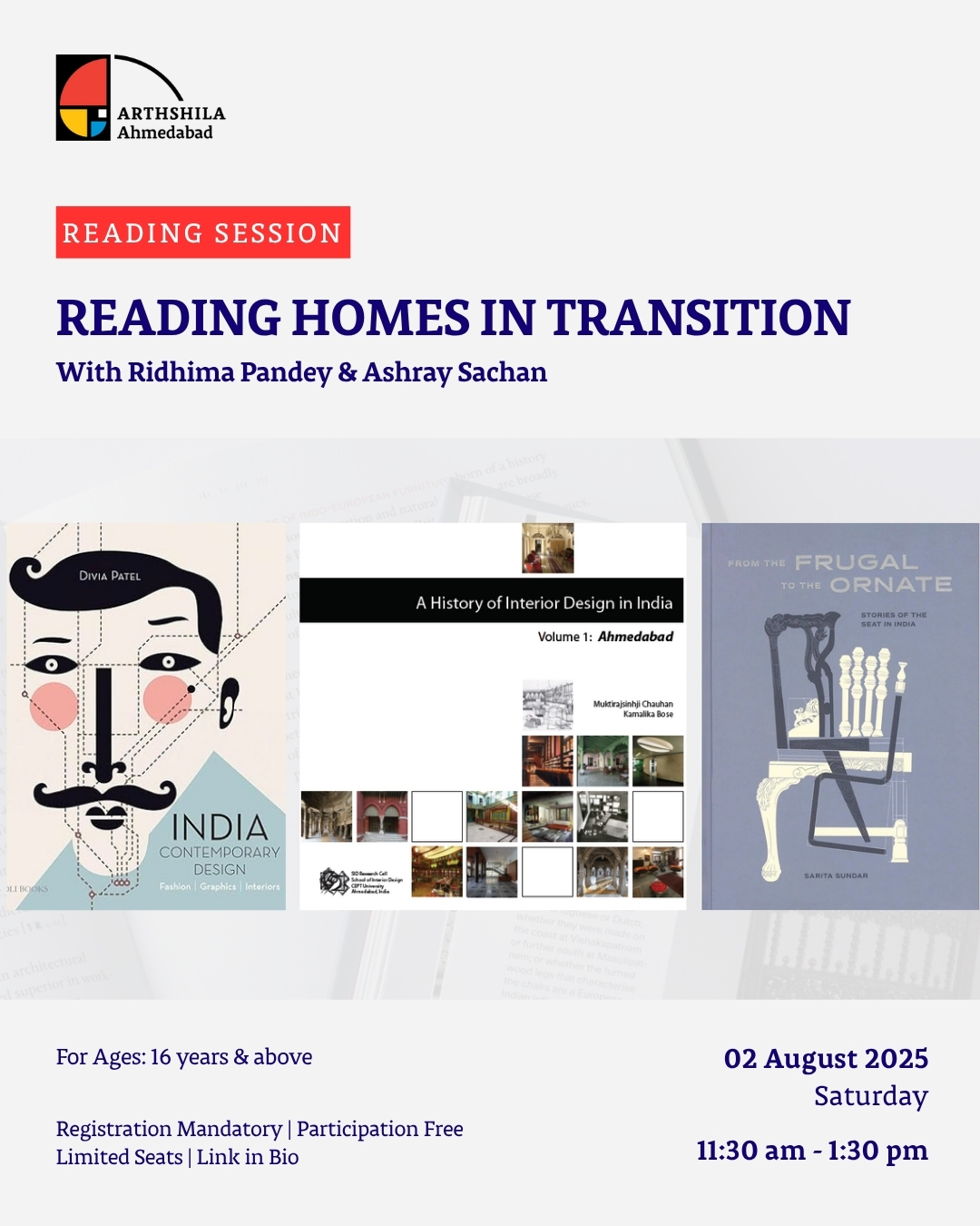 Join us at Arthshila Ahmedabad for a Book Reading Session with Ridhima Pandey and Ashray Sachan, titled ‘Reading Homes in Transition’. The session will explore three insightful books: History of Interior Design in India, India: Contemporary Design – Fashion, Graphics, Interiors, and From the Frugal to the Ornate – Stories of the Seat in India.