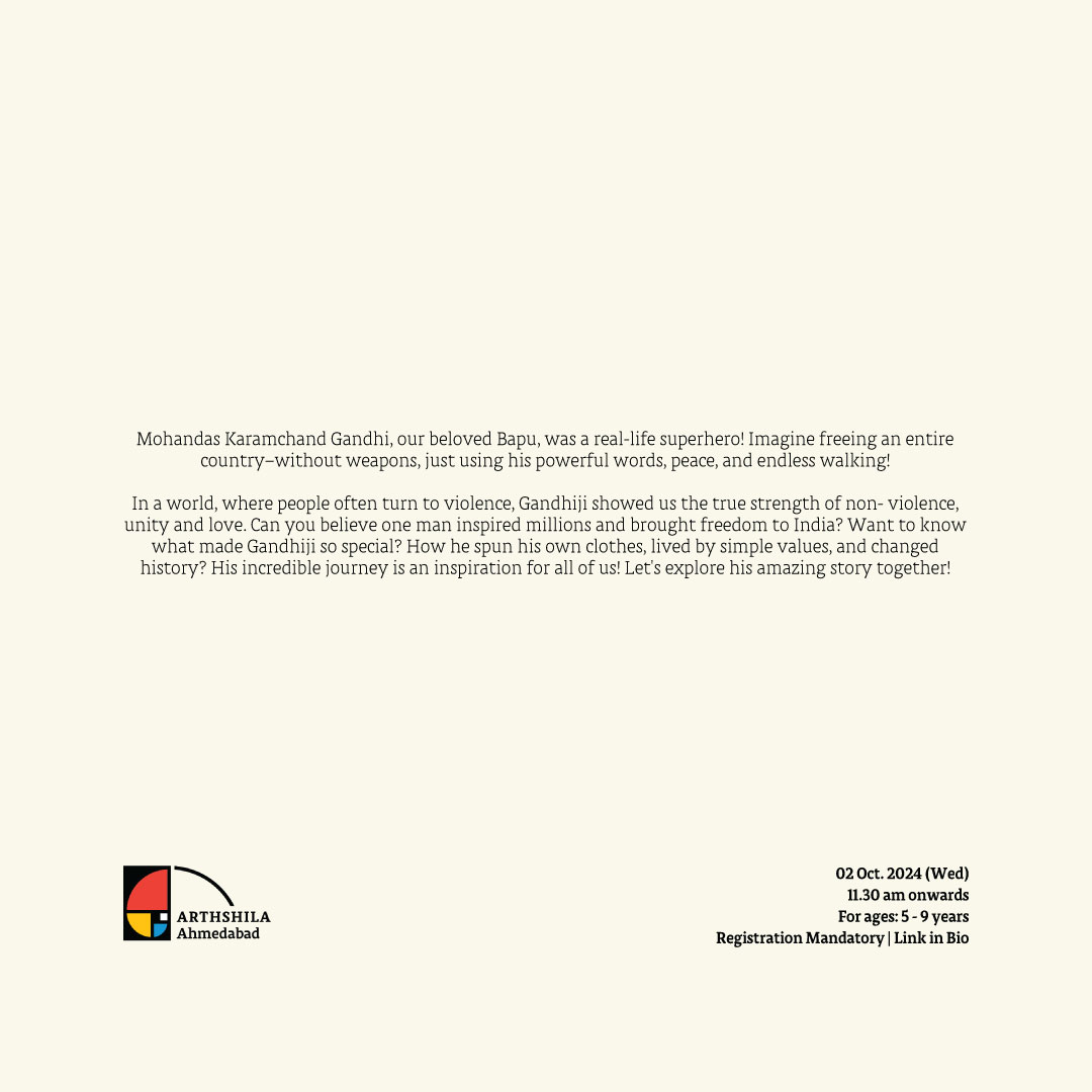 On the occasion of Gandhi Jayanti, Arthshila Ahmedabad invites you to ‘Spinning Tales of Bapu: An Interactive Story Session with Anita Shah’.