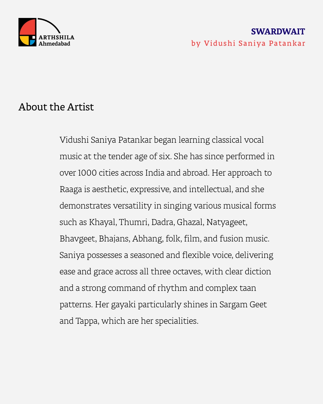 Vidushi Saniya Patankar began learning classical vocal music at the tender age of six. She has since performed in over 1000 cities across India and abroad. Her approach to Raaga is aesthetic, expressive, and intellectual, and she demonstrates versatility in singing various musical forms such as Khayal, Thumri, Dadra, Ghazal, Natyageet, Bhavgeet, Bhajans, Abhang, folk, film, and fusion music. Saniya possesses a seasoned and flexible voice, delivering ease and grace across all three octaves, with clear diction and a strong command of rhythm and complex taan patterns. Her gayaki particularly shines in Sargam Geet and Tappa, which are her specialities.