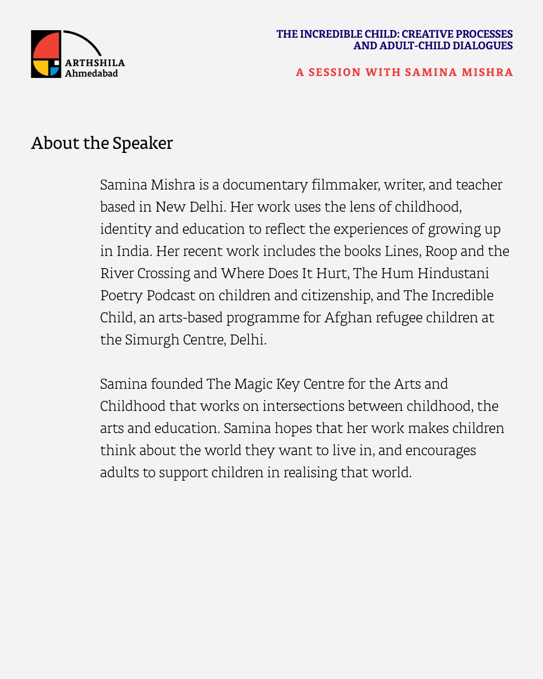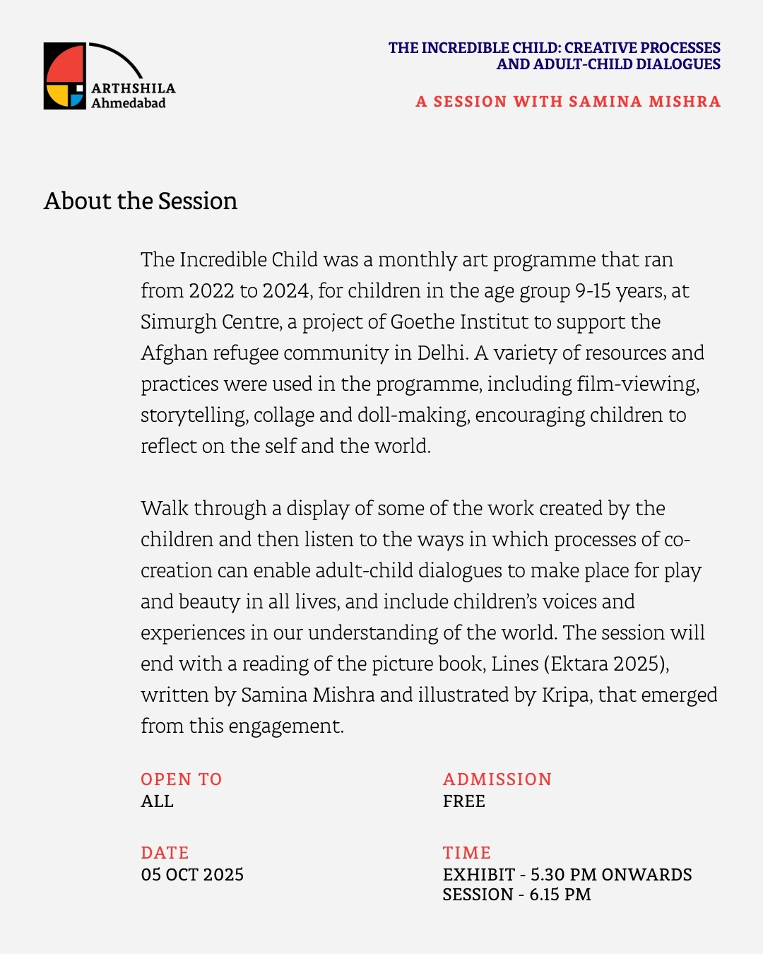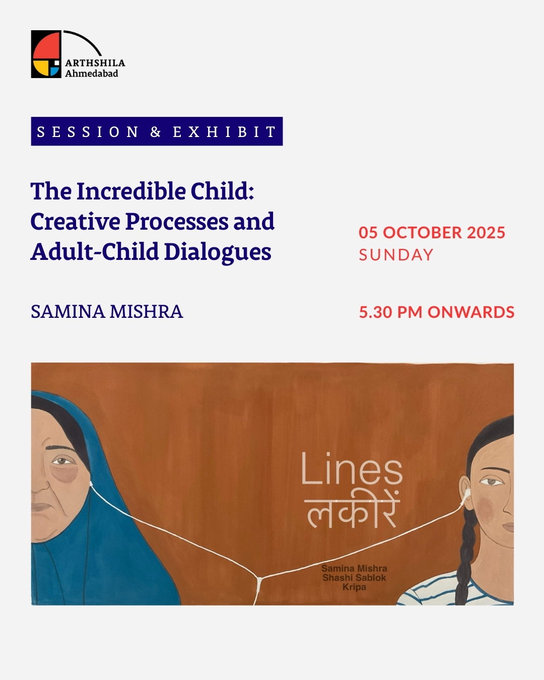 Join us at Arthshila Ahmedabad for a Session & Exhibit on ‘The Incredible Child: Creative Processes and Adult-Child Dialogues’ with Samina Mishra.
