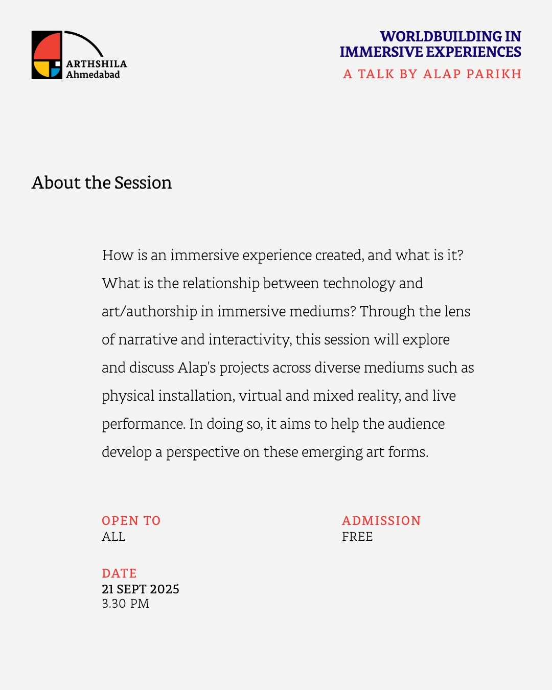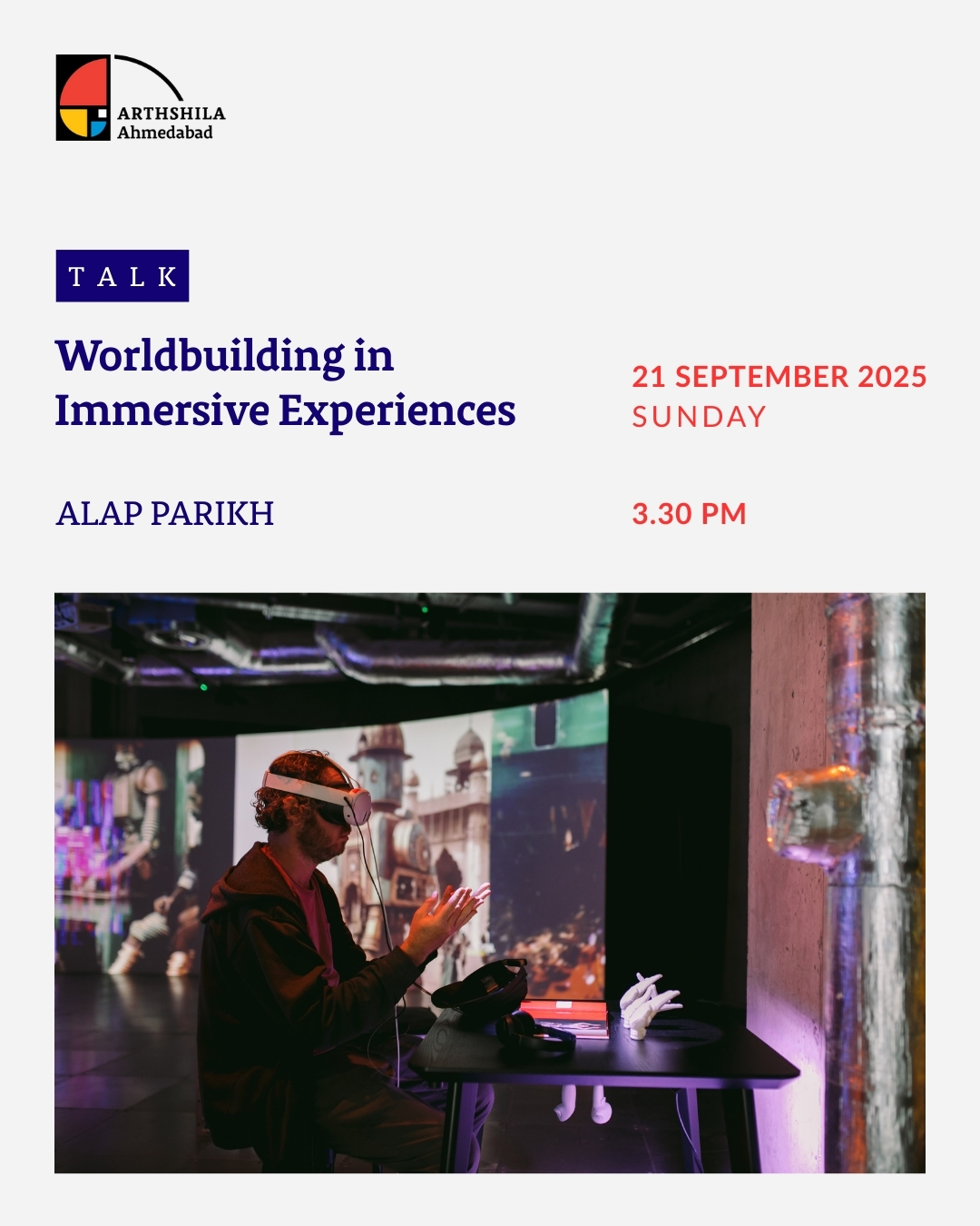 Join us at Arthshila Ahmedabad for a talk ‘Worldbuilding in Immersive Experiences’ by Alap Parikh.