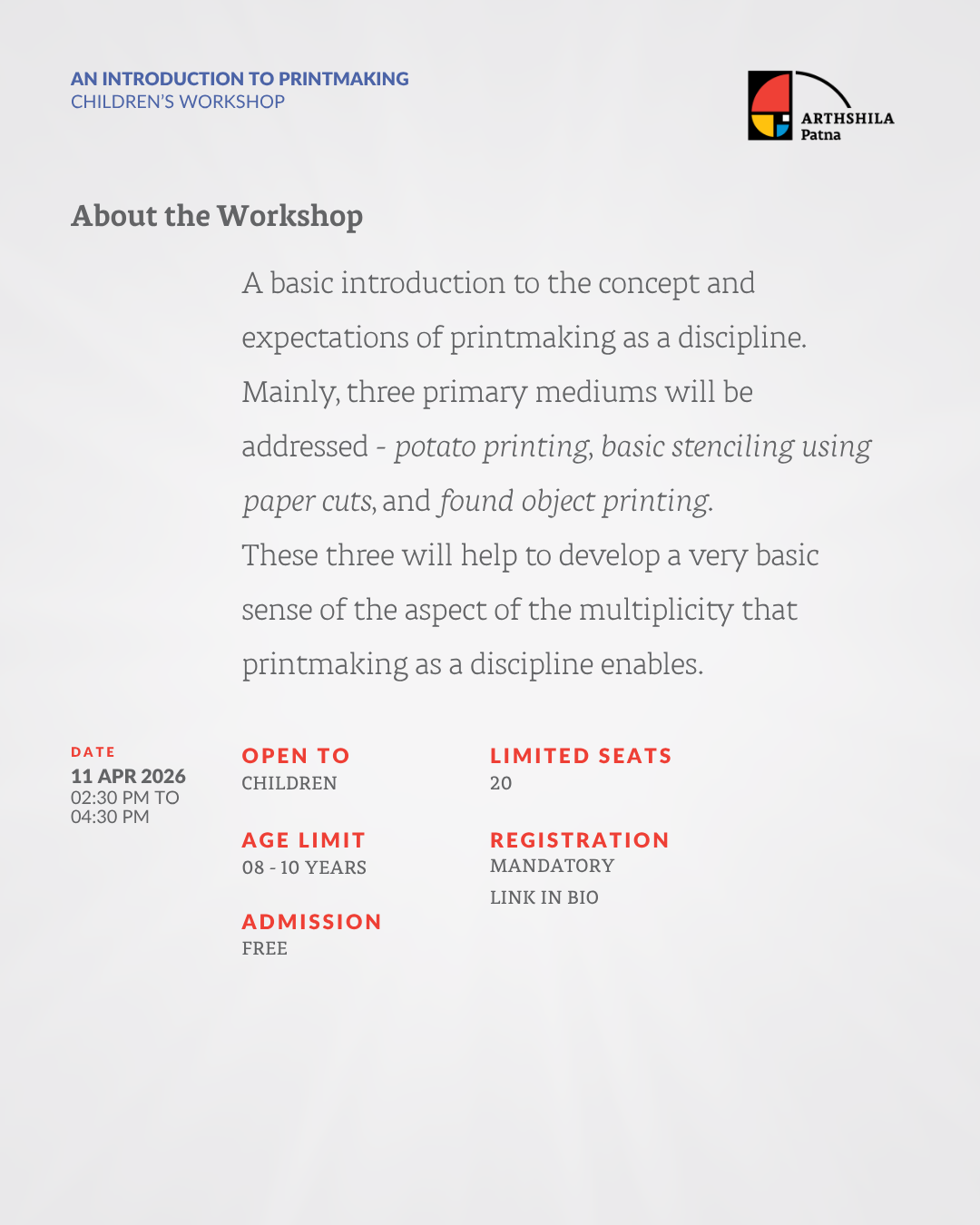 Join us at Arthshila Patna for the upcoming children’s workshop, “An Introduction to Printmaking” by Aranya Sengupta.