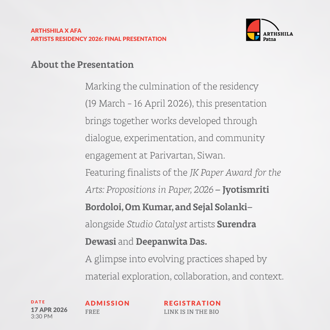 Join us for the Arthshila x AFA Artists Residency 2026 โ€“ Final Presentation, an engaging evening showcasing the outcomes of resident artistsโ€™ journeys of dialogue, experimentation, and material exploration at Parivartan, Siwan (Bihar).