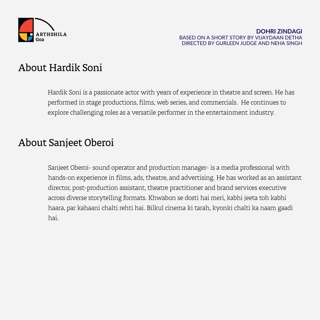 Join us for Dohri Zindagi, a play directed by Gurleen Judge and Neha Singh at Arthshila Goa.