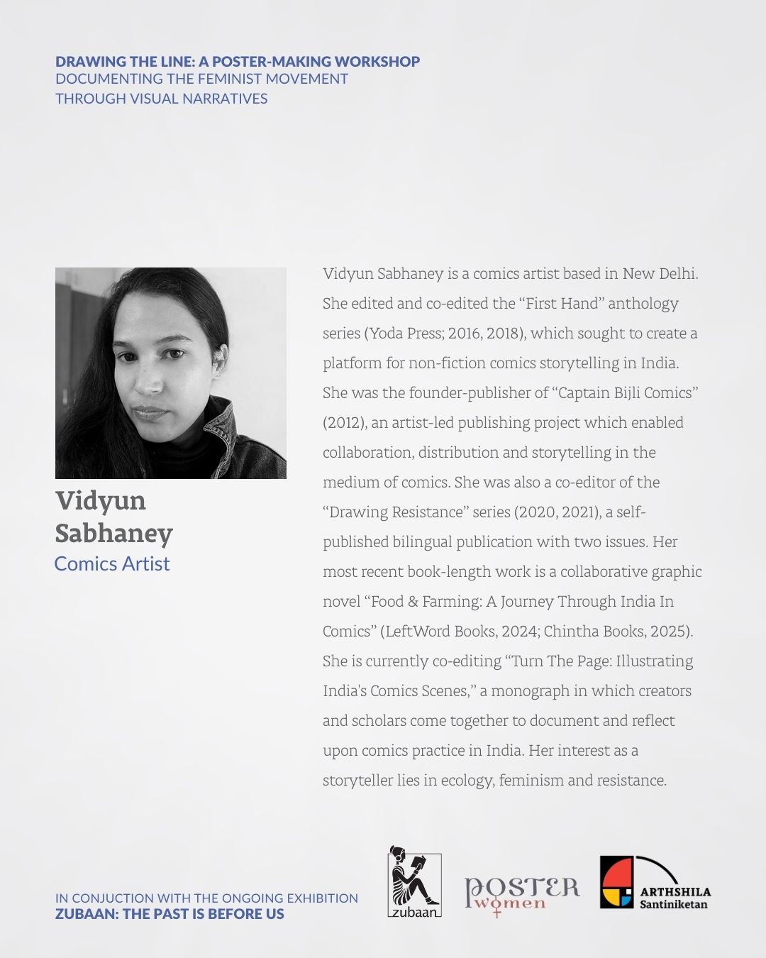 The workshop will be conducted by the well-known comics artist and storyteller Vidyun Sabhaney. The posters emerging from the workshop will be presented during the closing events of the exhibition in May 2026.