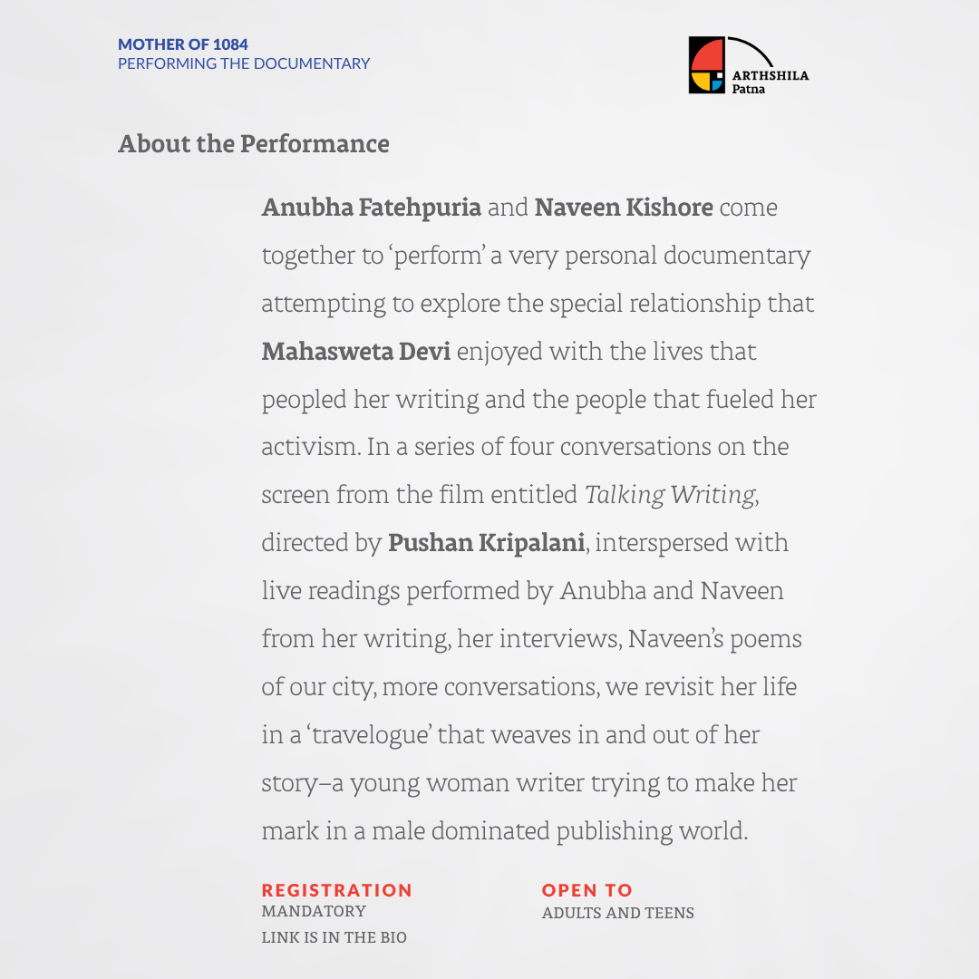 Join us at Arthshila Patna for the upcoming performance Mother of 1084: Performing the Documentary.