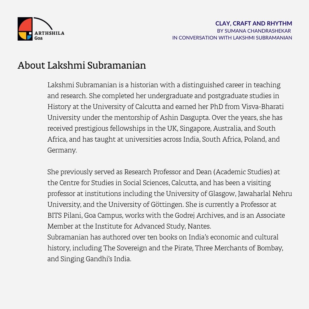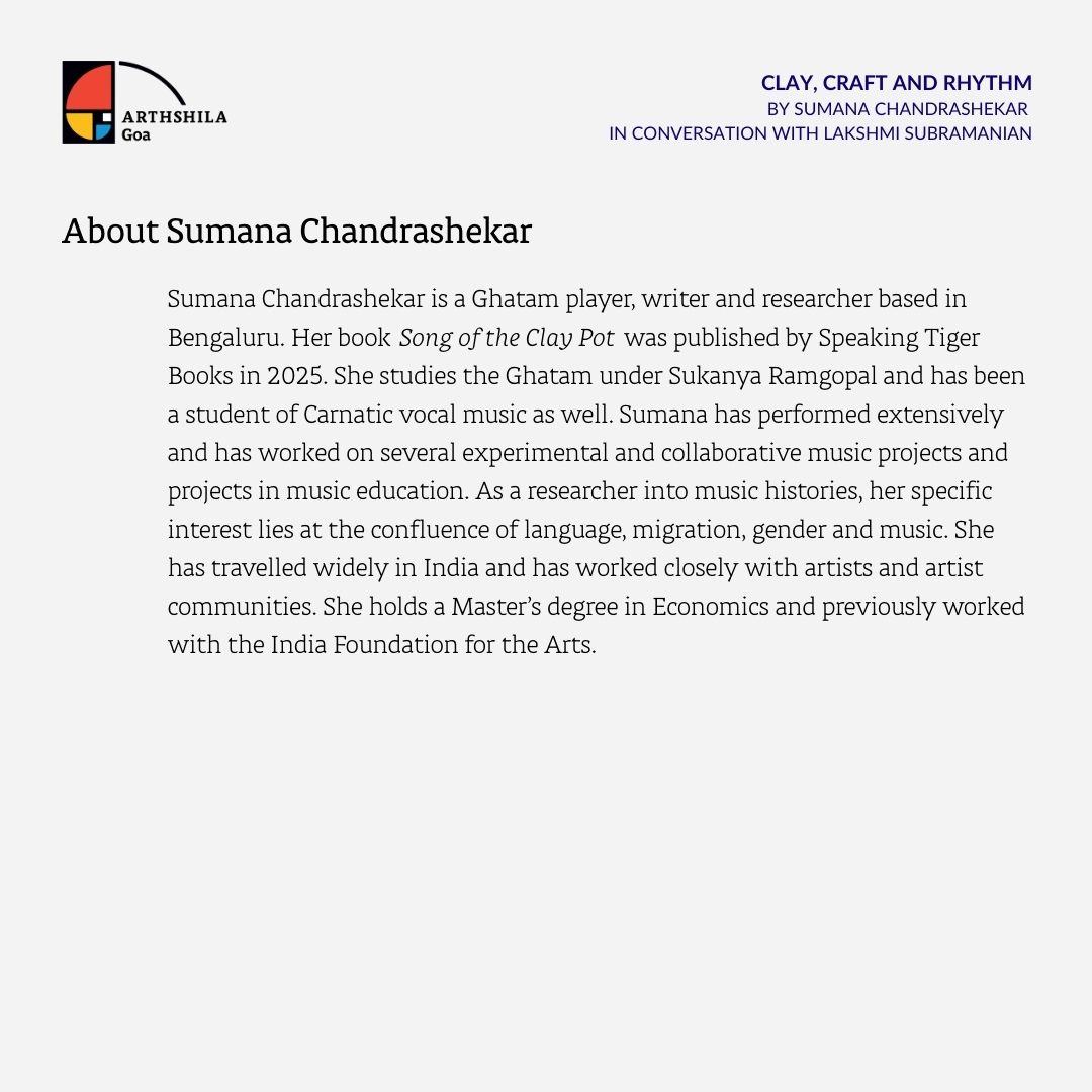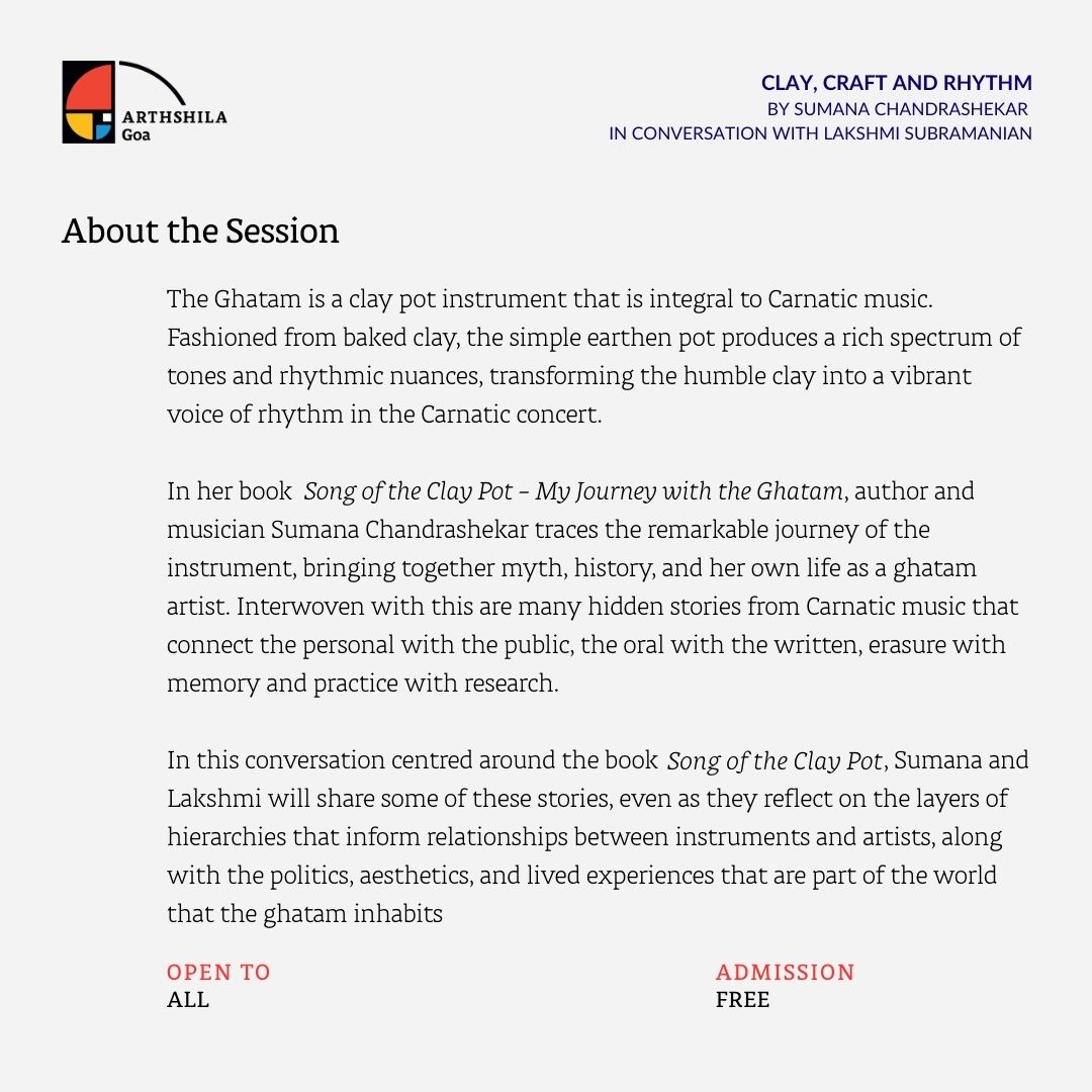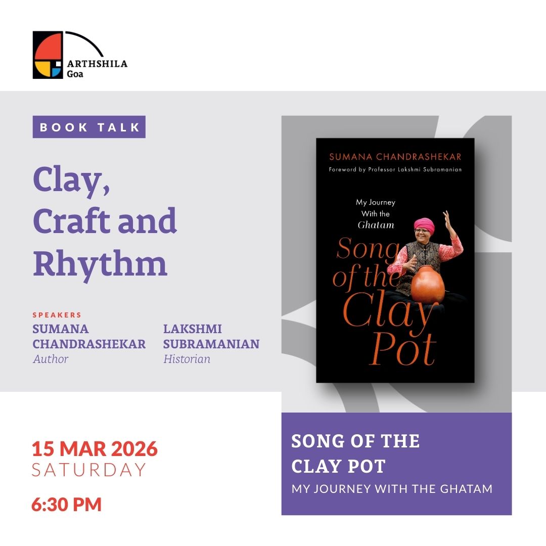 Join us for Clay, Craft and Rhythm by Sumana Chandrashekar, in conversation with Lakshmi Subramanian on the book Song of Clay Pot at Arthshila Goa.
