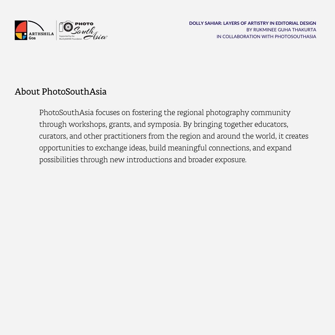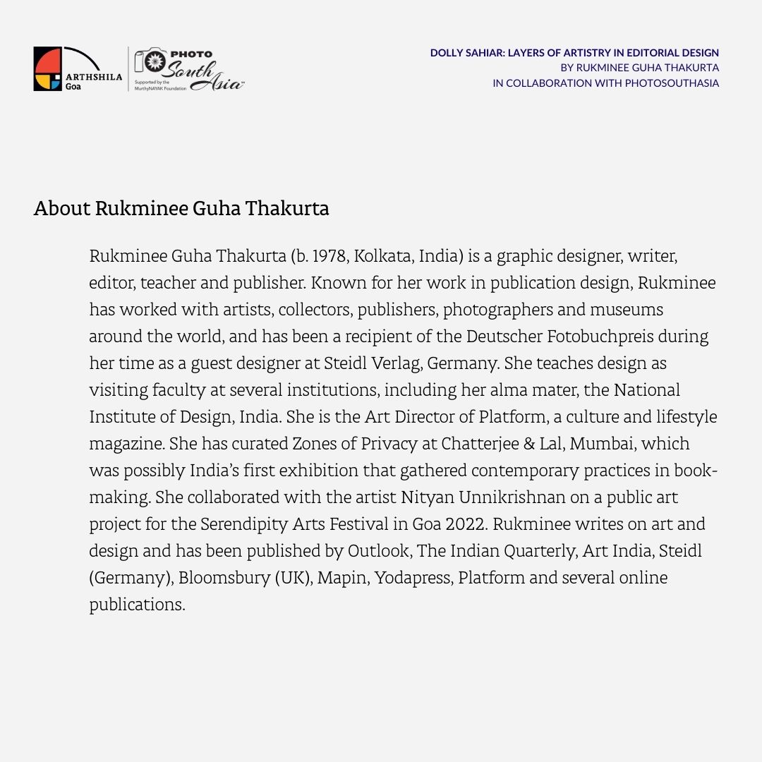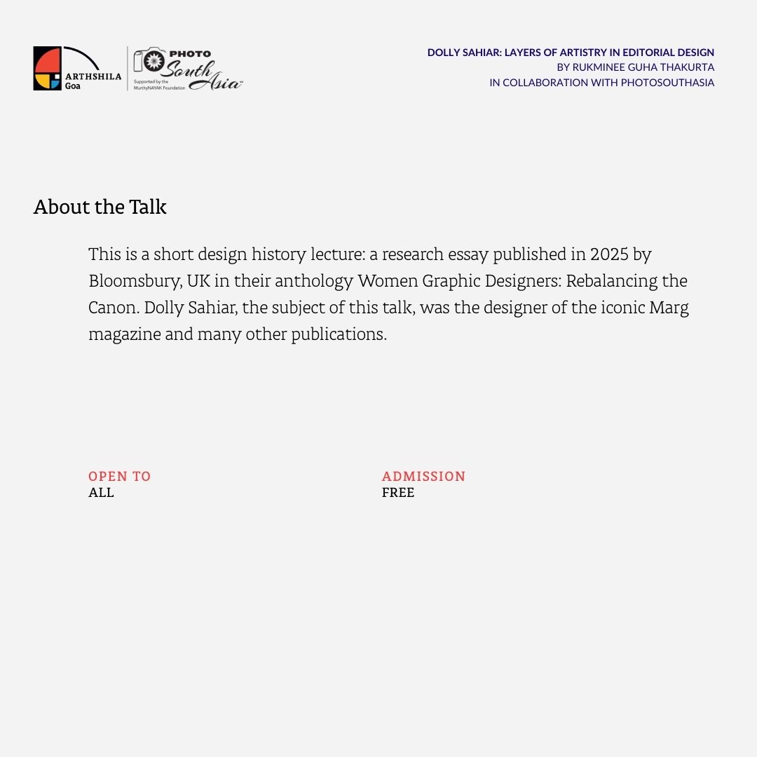 Join us for Dolly Sahiar: Layers of Artistry in Editorial Design, a talk by Rukminee Guha Thakurta presented in collaboration with PhotoSouthAsia at Arthshila Goa.