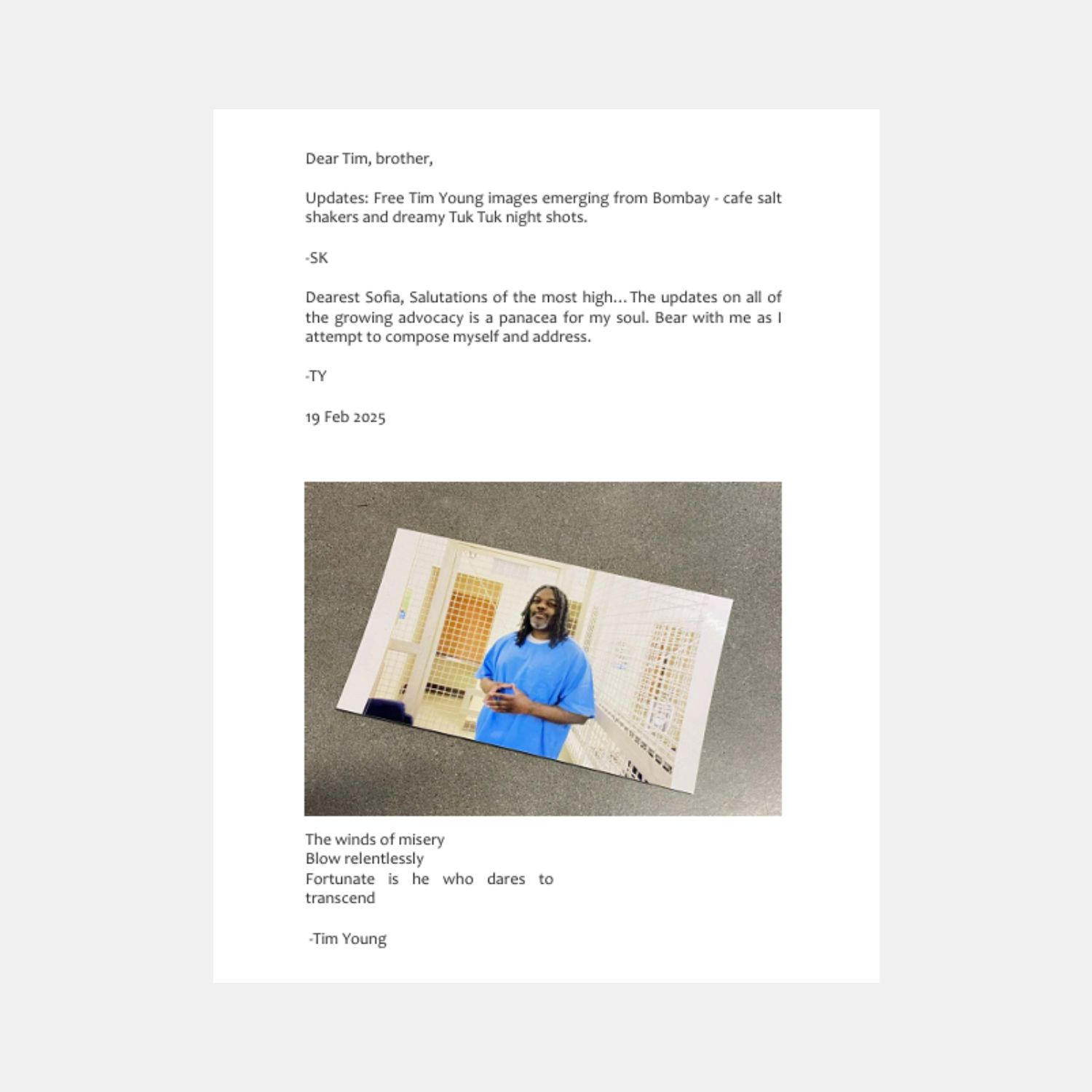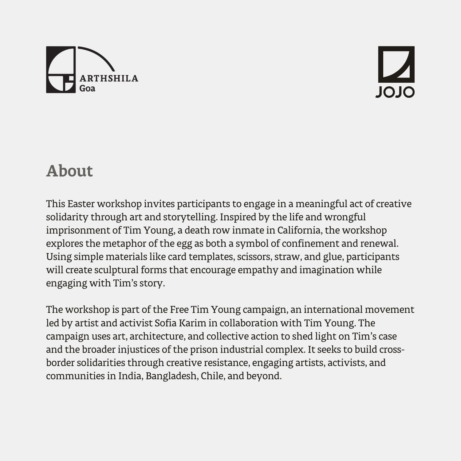 The workshop is part of the Free Tim Young campaign, an international movement led by artist and activist Sofia Karim in collaboration with Tim Young. The campaign uses art, architecture, and collective action to shed light on Tim’s case and the broader injustices of the prison industrial complex. It seeks to build cross-border solidarities through creative resistance, engaging artists, activists, and communities in India, Bangladesh, Chile, and beyond.