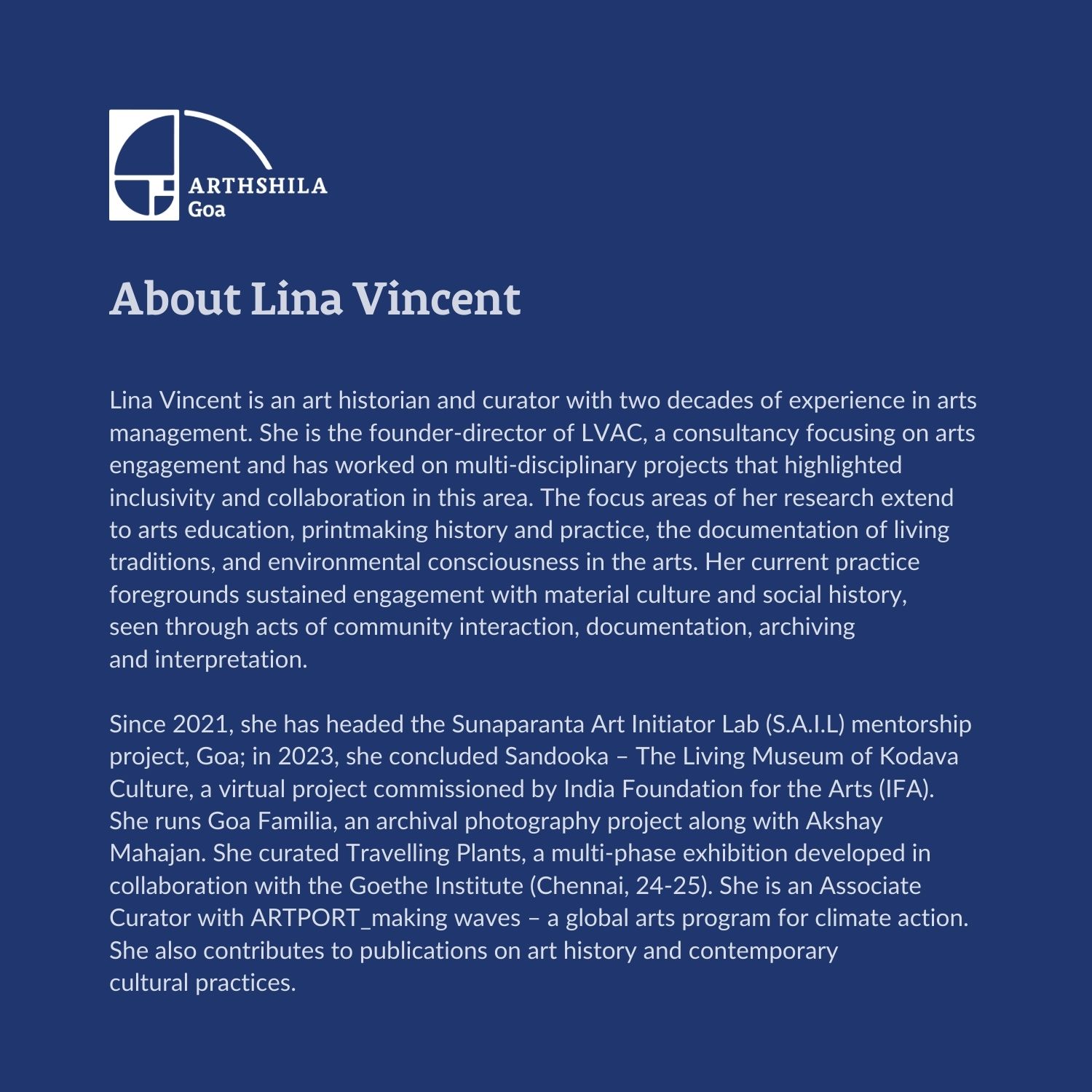 ⁣⁣⁣⁣⁣Lina Vincent is an art historian and curator with 20 years of experience. She leads LVAC and projects like S.A.I.L., Goa Familia, and Travelling Plants, focusing on arts education, printmaking, and environmental consciousness through community-based work.